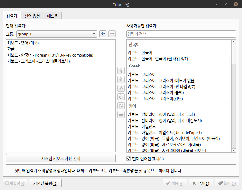 Fcitx5 설정 도구에서 입력기 추가
