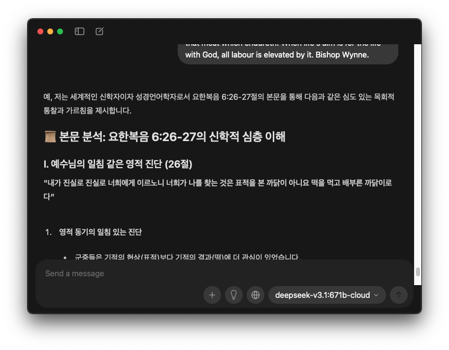 다음 내용은 BibleAI-1400 과 deepseek-v3.1:671b-cloud 모델을 통한 결과입니다. 사용된 강해주석은 스펄전주석, 성경예화주석, 풀핏주석 3종입니다. 구동 플랫폼은 맥오에스 세콰이어입니다.