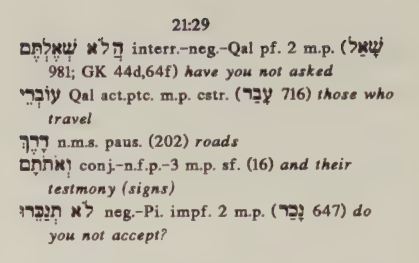 - Parsing: conj. + n.f.s.const. + suff. 3ms. + prep. + n.f.s.const. + suff. 3ms.