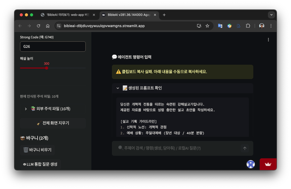 ?로 시작하는 AI 질문은 한글도 가능하나 탑재된 모듈들이 영어로 되어 있으므로 자료 내의 주제나 단어에 대한 에이전트 검색은 영어로 해야 합니다. 명령어는 "담아줘" 와 "생성" 2개이며 정상 작동합니다. 생성 명령 시 아래처럼 복사 실패와 수동 복사를 안내하는 메시지가 출력됩니다. 로컬앱에서는 정상 작동합니다. 이렇게 생성된 프롬프트를 복사하여 에이전트 대화창이나 다른 LLM 에게 주입하면 설교 원고 및 요청한 내용을 제공할 것입니다.