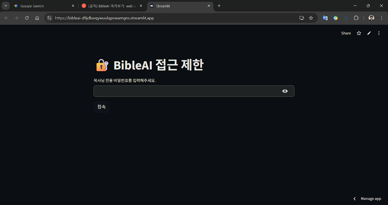 그동안 작성했던 BibleAI의 체험판으로 웹엡 형태로 스트림릿 클라우드에 올렸습니다. 아래 링크를 클릭하시면 브라우저에서 사용해 보실 수 있습니다. 클라우드에서 작동하는 관계로 미리보기와 원어사전 등의 기능이 제한됩니다. 일부 폴더만 올렸고 포함된 파일들도 일부입니다. 자료와 서버의 안전성을 위해 로그인 비번이 필요합니다. 비번은 "1440001057" 입니다.